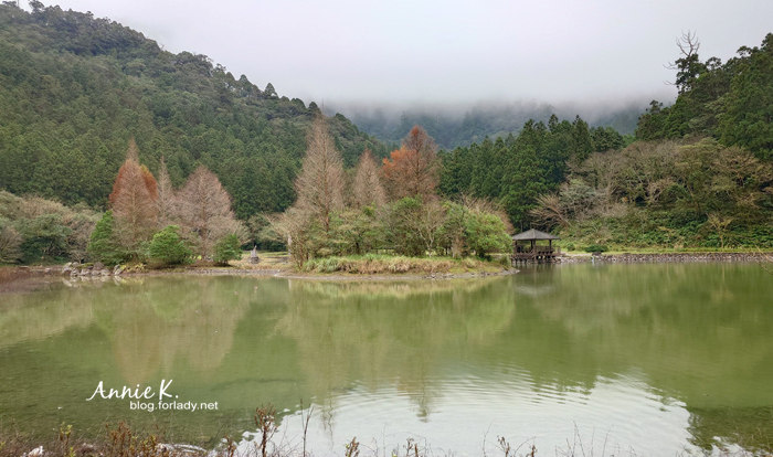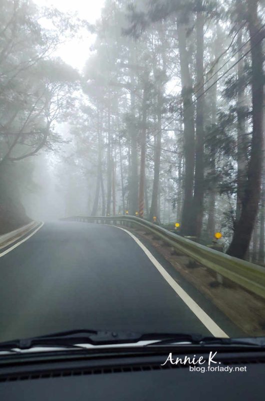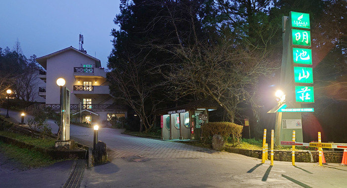 沿著台7線前往明池,一路雨霧繚繞,在難得的霧林帶中,因為能見度不佳,彎道又多,我看著導航地圖預判彎道,開了霧燈,注意著對面來車,慢慢行駛,到了明池山莊停車場,雨雖停了,但天色已暗。