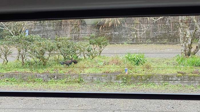 ▲坐在車內,從後門窗戶往外看見停車場上有野生的鳥在覓食中。