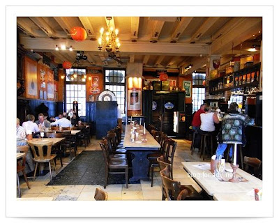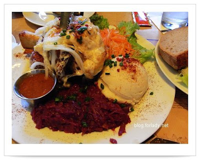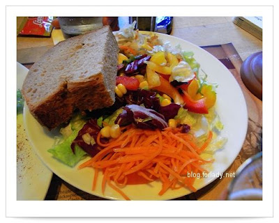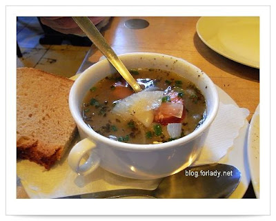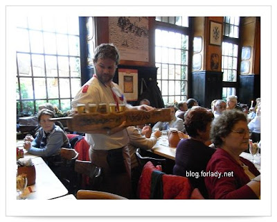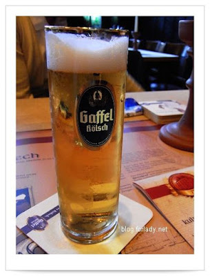 科隆式的豬腳在上面放了起士,裡面還有碎肝腸。裡面則與一般傳統口味的德國豬腳相同,但這家的調味一點也不鹹,拉起骨頭,肉輕輕拉扯就離骨,第一次嘗試德國豬腳的阿姨,是說雖然很傷牙齒,但是很好吃。的確最好吃的皮與炸的酥酥的肉,嚼起來非常的香呢!我們分享了一碗洋蔥湯、一份沙拉、一份豬腳。我則點了想望很久的科隆啤酒,細長秀氣的杯子中裝著的啤酒很順口,比較清淡,但喝完口中有股香氣,這陣子在德國各地喝的啤酒,都很好喝,而且風味都不同。(後來阿姨還在超商買了三瓶,準備帶回瑞士,但瓶裝應會比在店中喝現打的啤酒略為遜色吧!)