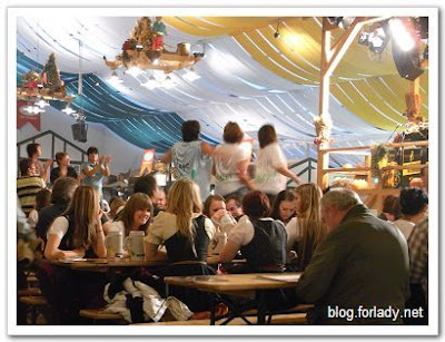 吃飽喝足後,走出帳篷,天已經黑透,外面霓虹閃爍好不熱鬧,逛著逛著發現帳篷裡居然HIGH了,我們又開始逛帳篷,在表演團體的帶動下,大家都站在椅子上唱著跳著,一個階段結束後就會拿起大啤酒杯,咕魯咕魯的喝著,感覺是藉酒壯膽裝瘋,解放保守嚴肅的外表。
