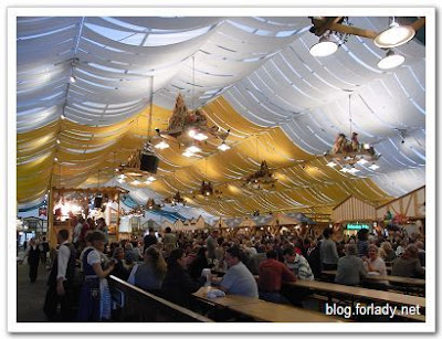 走到裡面,才看見啤酒帳篷,大帳篷有三個,我們挑了一個進去,基本上此時是完全不知道該如何玩,只好發揮觀察力,看見桌上有菜單,應該是坐下後可以點餐,然後,看見德文菜單,又開始頭大。帳棚內又十分吵,說話也要十分大聲,侍者看起來都不大通英文,於是,我們又用老方法,拿起菜單去問點菜的人,但這次更厲害,直接衝向後面的廚房,指著烤豬腳與烤雞,請工作人員幫我們指出是菜單上哪道菜,工作人員也很熱心的還幫我們推薦了啤酒。