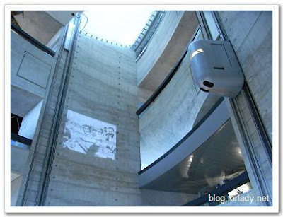 一進到賓士博物館,還沒有買票就被牆壁上隨著電梯上下的影片播放給吸引。