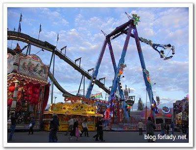 回程時,我們搭了兩站公車抵達啤酒節會場,事實上不管啤酒這件事不過是個佔地寬廣的遊樂場,摩天輪、大怒神、海盜船等各式各樣驚險設施都有,還有賣玩具、套環、小吃攤等。
