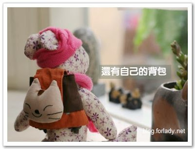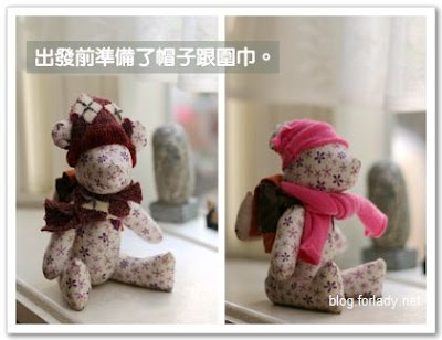 10月紫花熊就要去一訪COCO的故鄉。看最近的氣象,發現那邊已經很冷了,於是用了舊襪子跟碎布做了帽子跟圍巾,葛媽媽則捐贈手機袋一只,並且改成後背包,讓紫花熊使用。