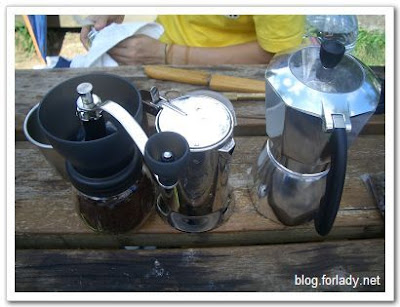 阿寶妹的咖啡機私帶的可真豐富,除了手工直火烘焙莊園咖啡豆外,還有手動陶瓷磨豆機及兩個摩卡壺。